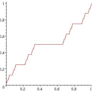 でも実は存在します。ほぼどの点を取っても微分が\(0\)で全ての点で連続で、しかもいつの間にか増加している関数が存在します。"悪魔の階段"と呼ばれる関数です。